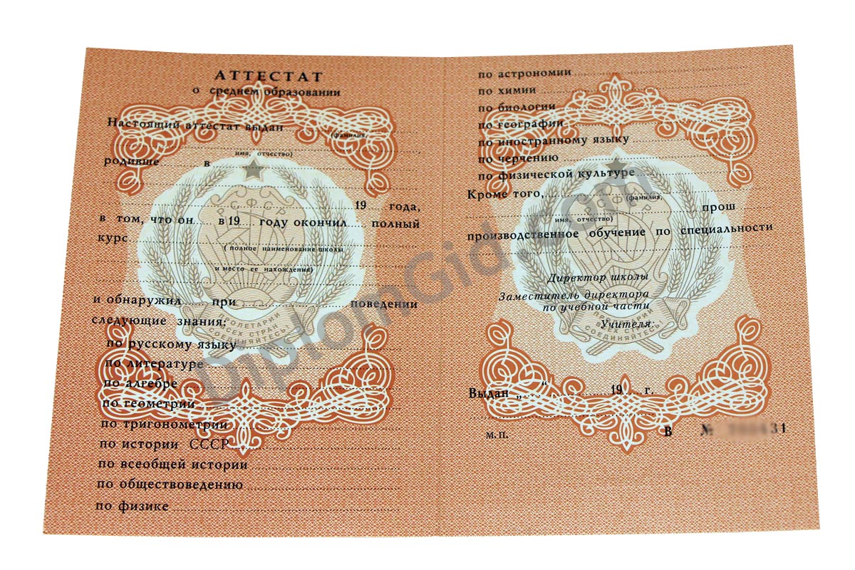 Аттестат школы об окончании 11 или 10 классов старого образца СССР с выдачей до 1994 года. Имеет советскую символику, заполняется по стандартам того времени, заверяется гербовой печатью РСФСР, подписью директора и других ответственных лиц. Аттестат как в школе!